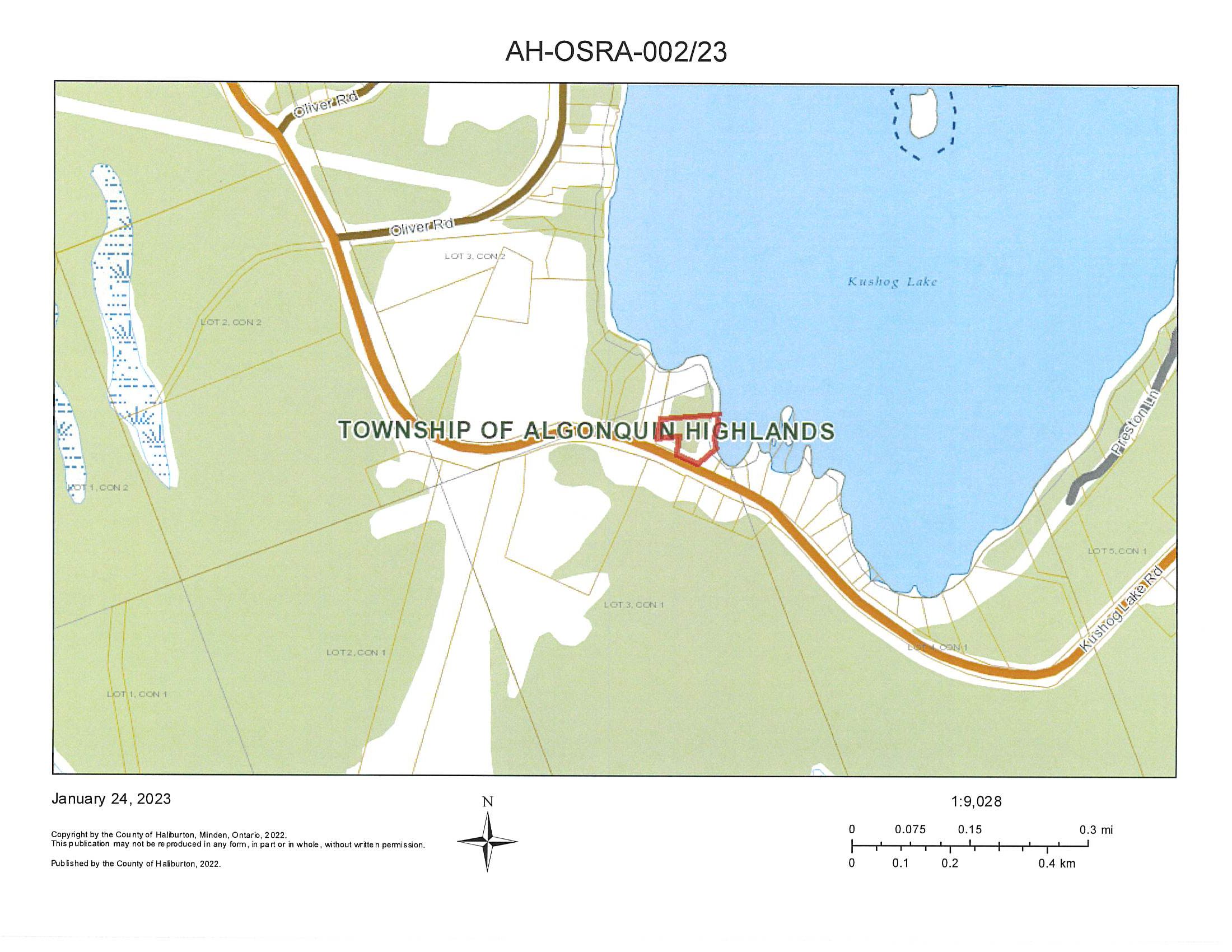 WHEREAS the Council of the Corporation of the Township of Algonquin Highlands has declared part of the original shore road allowance lying in front of Lot 3, Concession 1, Kushog Lake, in the geographic Township of Stanhope, in the Township of Algonquin Highlands, County of Haliburton, to be surplus.